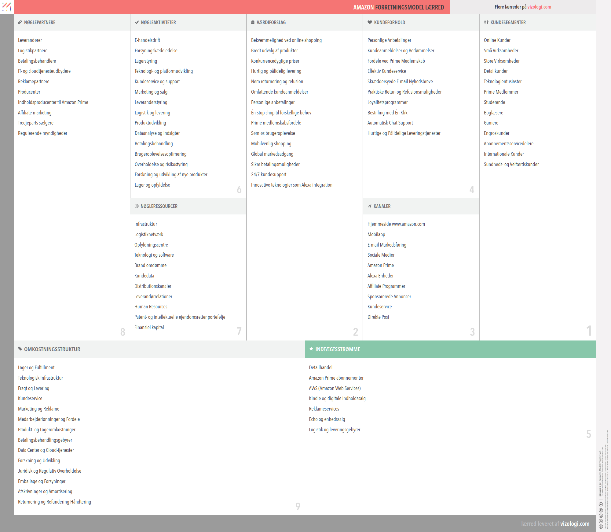 Amazon opererer med en multifacetteret forretningsmodel, der understøtter dens succes. Virksomheden udnytter avanceret teknologi til at forbedre brugeroplevelsen, ved at bruge sofistikerede algoritmer og maskinlæring til personlig tilpassede anbefalinger og effektiv logistikstyring. Desuden sikrer Amazons omfattende globale opfyldelsesnetværk hurtig levering og distributionskapacitet. Virksomhedens unikke værdiforslag omfatter ikke en omfattende online markedsplads, men også innovationer som Amazon Web Services (AWS), en robust cloud computing-platform, der betjener virksomheder over hele verden. Derudover gør Amazon Marketplace det muligt for tredjeparts sælgere at nå en bred kundebase, hvilket udvider produktvariationen og driver konkurrencepriser.