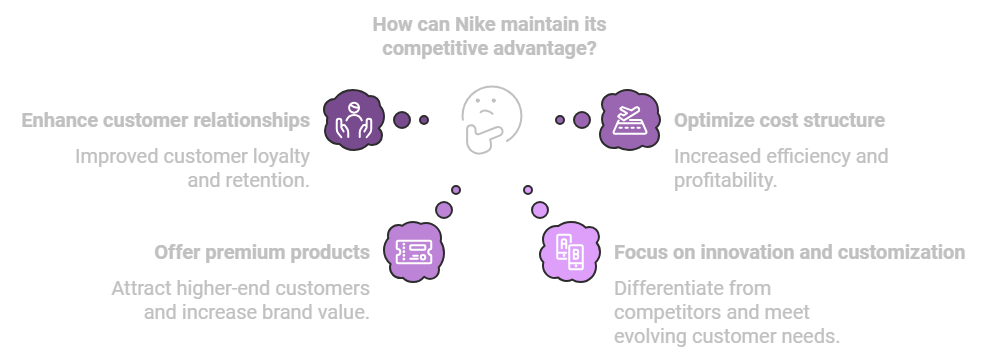 Nike faces challenges in maintaining accessibility, innovation, and customization. The company needs to meet customer needs in a competitive market. To maintain the appeal of its products, Nike must enhance customer relationships and sales channels. To stay competitive, Nike should offer premium products and frequent enhancements. It also needs to optimize its cost structure and revenue streams.