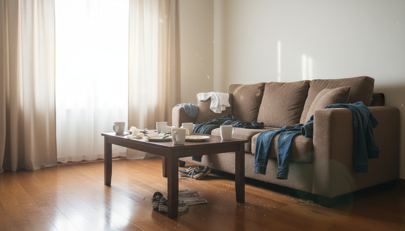 - Start Frame: A messy living room.