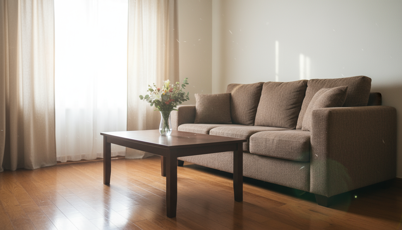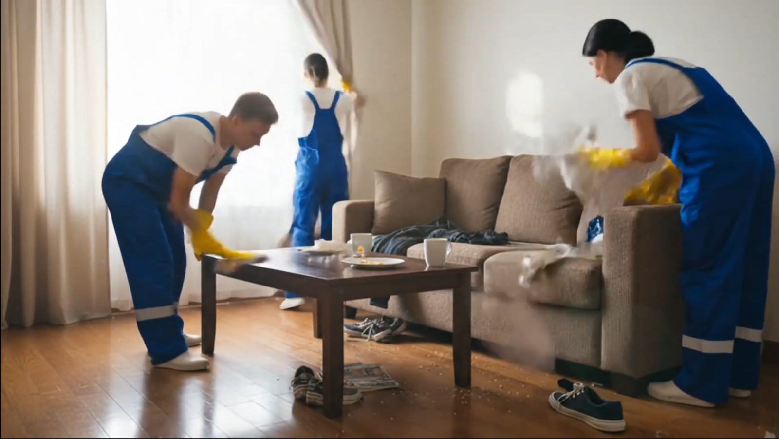 “Generate a 15-second time-lapse of a professional cleaning crew transforming a cluttered living room into an organized space. Show vacuuming, dusting, and arranging furniture. Sunlight streams through the window. Mood: productive and satisfying.”